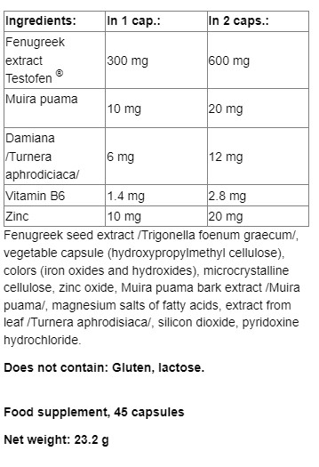 Основата на препарата е Testofen®, който се получава от семената на сминдух (Trigonella foenum graecum) чрез специален процес на екстракция, който позволява концентрирането на група активни принципи (сапонини), регистрирани под търговското наименование FenusideTM. Сапонините на Testofen® действат върху сексуалното здраве на мъжете. Клинично доказано е, че този екстракт насърчава либидото, сексуалната жизненост и желание.