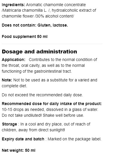Съставки: Ароматен концентрат от лайка /Matricaria chamomilla L. /, хидроалкохолен екстракт от цвят на лайка /30% съдържание на алкохол/