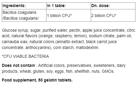 acidophilus и B. longum, които подпомагат храносмилателния баланс, имунното здраве и здравето на дебелото черво, като в същото време предпазват от периодично подуване на корема, запек и храносмилателен дискомфорт. Пробиотик
