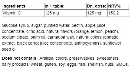 Тези вегански гумени бонбони с витамин С, които не съдържат желатин, са вкусен начин за попълване на дневните нива на витамин С. Предлагат се в естествено овкусени варианти с вкус на лимон, портокал и праскова.