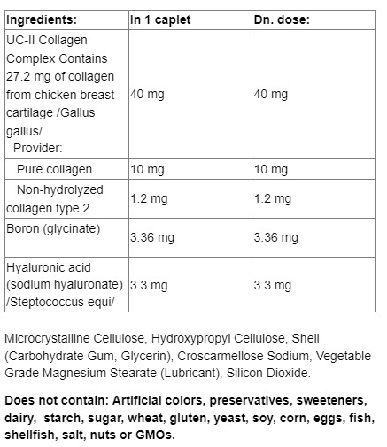 Усъвършенстваният колаген + хиалуронова киселина и бор съчетава клинично проучен UC-II колагенов комплекс с хиалуронова киселина и бор, за да подпомогне здравето на ставите - всичко това само в една миникапсула на ден. Колагенът играе важна роля в образуването на ставния хрущял. UC-II колагенов комплекс е патентована форма на неденатуриран колаген тип II, който подпомага здравето на ставите. Като запазва неденатурираната си форма, колаген тип II запазва биологичната си активност и ефективност в организма. Всяка миникапсула съдържа 40 mg UC-II. Това е същата доза, която, както е доказано в клинични проучвания, спомага за облекчаване на болките и сковаността в ставите при хора, страдащи от остеоартрит, за намаляване на остеоартритната болка в колянната става при ходене и изкачване на стълби и за подобряване на подвижността при хора, страдащи от остеоартрит.