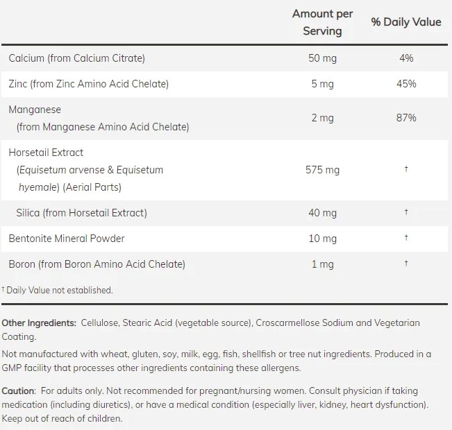 Силициевият диоксид е естествен елемент, необходим за производството на колаген и гликозаминогликан - две структурни съединения, важни за здравето на кожата и ставите.* Той също така е важен компонент за здравината на косата и ноктите