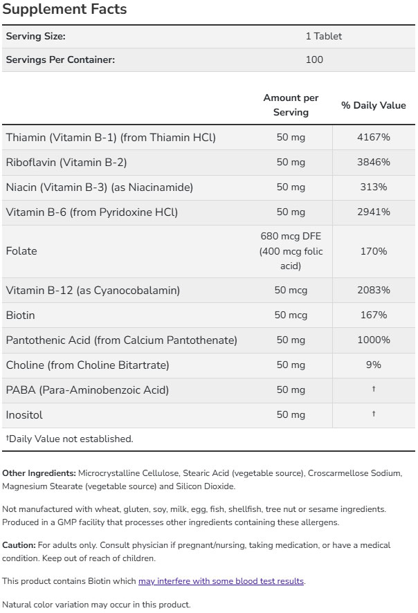 Таблетките B-50 осигуряват пълен набор от витамини от група В, както и холин и инозитол. Тези витамини подпомагат производството на енергия, поддържат здравословен метаболизъм на хомоцистеина и укрепват здравето на нервната система.* Витамините от група В са водоразтворими и с изключение на В-12 имат ограничено съхранение в организма, поради което се нуждаят от ежедневно попълване. Въпреки че В-12 се съхранява в черния дроб, хранителните източници са само от животински произход (месо и млечни продукти) и добавянето на В-12 може да е особено важно за вегетарианците.
