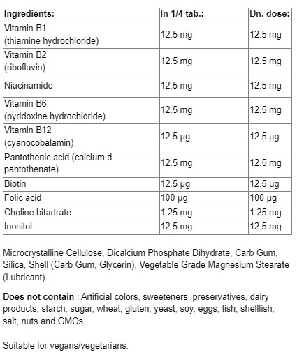 Съставки: Витамин В1 (тиаминов хидрохлорид), Витамин В2 (рибофлавин), Ниацинамид, Витамин В6 (пиридоксин хидрохлорид), Витамин В12 (цианокобаламин), Биотин, Фолиева киселина (фолат), Пантотенова киселина (калциев d-пантотенат), Холин битартрат, Инозитол