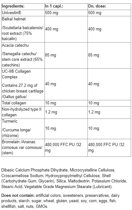 Благодарение на мощта на патентования UC-II колагенов комплекс се нуждаете само от една капсула на ден, за да се възползвате от предимствата на тази формула за ставите и подвижността. Всяка капсула е изпълнена с колаген тип II, куркума, бромелаин, както и стандартизирани екстракти от корен на байкалски скорец и катеху (клинично изследван Унивестин).