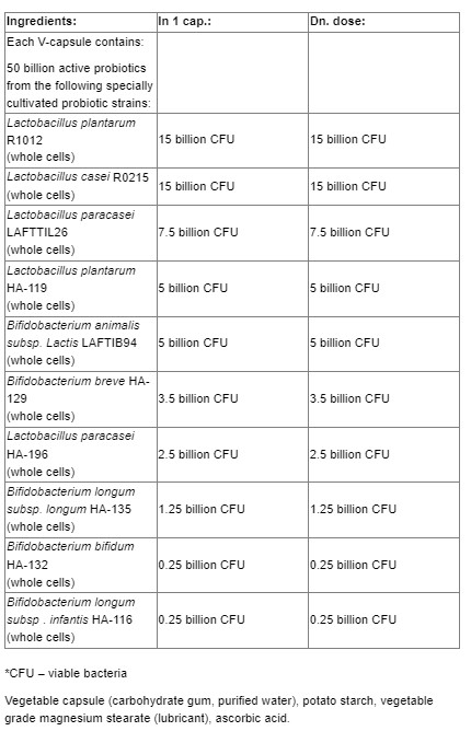 Пробиотик 50 милиарда съдържа 10 оптимални щама за здравето на червата: 5 щама лактобацили за грижа за тънките черва и 5 щама бифидобактерии за грижа за дебелото черво. Тези щамове са устойчиви на стомашна киселина, така че са в състояние да достигнат до чревния тракт. Освен това тези капсули са устойчиви на съхранение, което означава, че не се нуждаят от охлаждане.