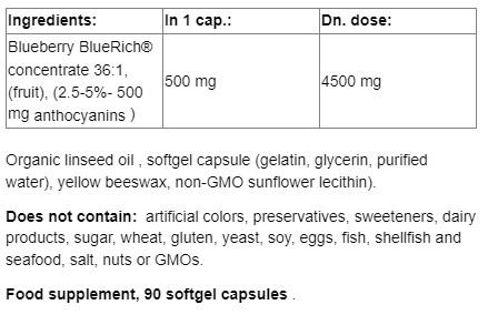 Всеки софтгел BlueRich Super Strength Blueberry Concentrate от 500 mg съдържа немодифицирана (генетично модифицирана) боровинка в концентрация 36:1 (36 грама боровинка се равняват на един грам концентрат), стандартизирана до 2,5 % антоцианини, без замърсяване с пестициди или хербициди.