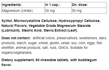 Natural Factors Kid's Magnesium съдържа 50 mg биодостъпен магнезиев цитрат във вкусна таблетка за дъвчене с вкус на дъвка. Цитратната форма на магнезия се усвоява изключително добре и се понася добре от организма, а магнезият е необходим за стотици ензимни реакции в организма и за нормалната сърдечна дейност. Необходим е за синтеза на протеини, въглехидратния метаболизъм, правилната мускулна функция и подпомага усвояването на калция и калия.