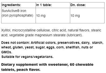 Бонбонитесъдържатжелязо SunActive®, добре проучен и високо биоусвоим източник на желязо от железен пирофосфат. То е произведено по технология за микронизация, която значително подобрява усвояването на желязото в организма и е щадяща за стомашно-чревната система, така че не разстройва чувствителните стомаси. Тази формула е подходяща за деца на възраст от три години и повече и осигурява 10 mg елементарно желязо на ден. Дъвчащите се таблетки с вкус на кисела праскова са вкусни и помагат на децата и юношите да се вълнуват от ежедневния прием на желязна добавка. Те не съдържат ГМО, глутен, захар или изкуствени подсладители и са подходящи за вегетарианци и вегани.