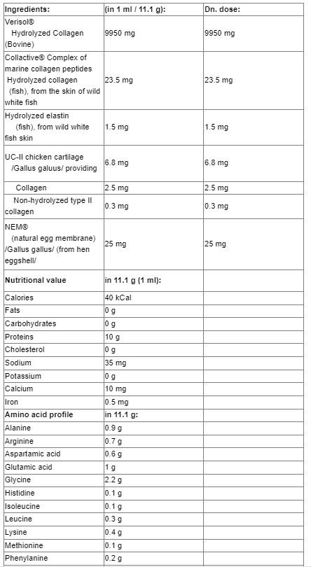 Съдържа хиалуронова киселина, витамин С, биотин, L-глутамин и L-триптофан