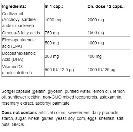 Комбинацията от Омега3 мастни киселини заедно с витамин Д3 ви дава всичко необходимо за правилното функциониране на сърдечно-съдовата система, подсилване на имунната система, както и заздравяване на съединителната тъкан и костите.