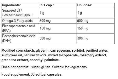 Съставки: Масло от водорасли (Schizochytrium spp.), Омега-3 мастни киселини, Докозахексаенова киселина (DHA), Ейкозапентаенова киселина (EPA), Други съставки: модифицирано царевично нишесте, глицерин, карагенан, сорбитол, пречистена вода, слънчогледово масло, натурален аромат, консерванти за поддържане на свежестта (смесени токофероли, екстракт от розмарин, екстракт от зелен чай, аскорбил палмитат)