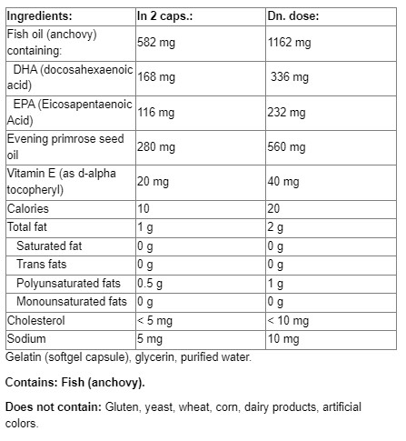 EFA Blend for Kidsпредоставя отлично съотношение на ключовите за организма есенциални мастни киселини: 20% ейкозапентаенова киселина (EPA), 30% докозахексаенова киселина (DHA) от молекулярно дестилирано рибено масло от аншоа, 9% гама-линоленова киселина (GLA) от масло от вечерна иглика, плюс витамин Е.