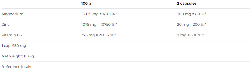 Nutrend ZMA съдържа цинк и магнезий във високо - усвоима форма за организма. Цинкът е свързан с незаменимите аминокиселини метионин и аспартанова киселина. Магнезият от своя страна  също е свързан с аспартат. По този начин се намират под форма, използвана от организма за пренос до зоната за усвояване. За постигане на увеличена абсорбция е добавен витамин