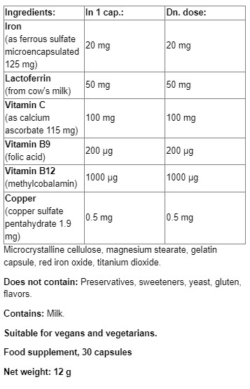 Мощна Лактоферинна формула с женязо и минерали за подобряване на кръвообращението, подобрено усвояване на кислорода и увеличаване на червените кръвни клетки.