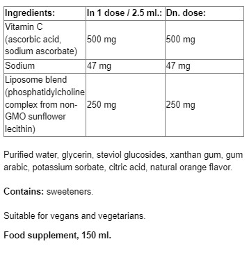 Съставки: Витамин С (като аскорбинова киселина и натриев аскорбат), Липозомна смес: комплекс от фосфатидилхолини (от генетично немодифициран слънчоглед)