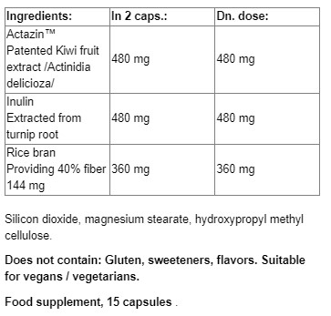 Съставки: патентован екстракт от плодове на киви, инулин (от корен на цикория), житни трици (осигурява 40% ръжени фибри). други съставки: силициев диоксид, магнезиев стеарат, хидроксипропилметилцелулоза