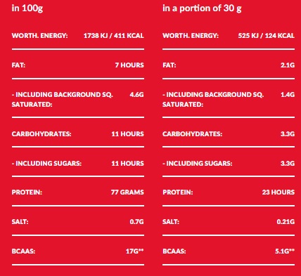 Състав: суроватъчен протеинов концентрат (от краве мляко), какао, аромати, подсладител: сукралоза, емулгатор: лецитини, сол, сгъстител: арабска гума