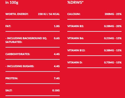 Състав: в 100 мл.: Енергия: 238 kj / 56 kcal, Мазнини: 1 гр., Въглехидрати: 4.4 гр., от които захари: 4.4 гр., Протеини: 7.4 гр., Соли: 0.18 гр. Съдържание на лактоза: < 1.0 гр. Калций: 200 мг., Витамин В2: 0,28 мг., Витамин В6: 0,21 мг., Витамин В12: 0,38 μg, Витамин D: 0,75 μg.