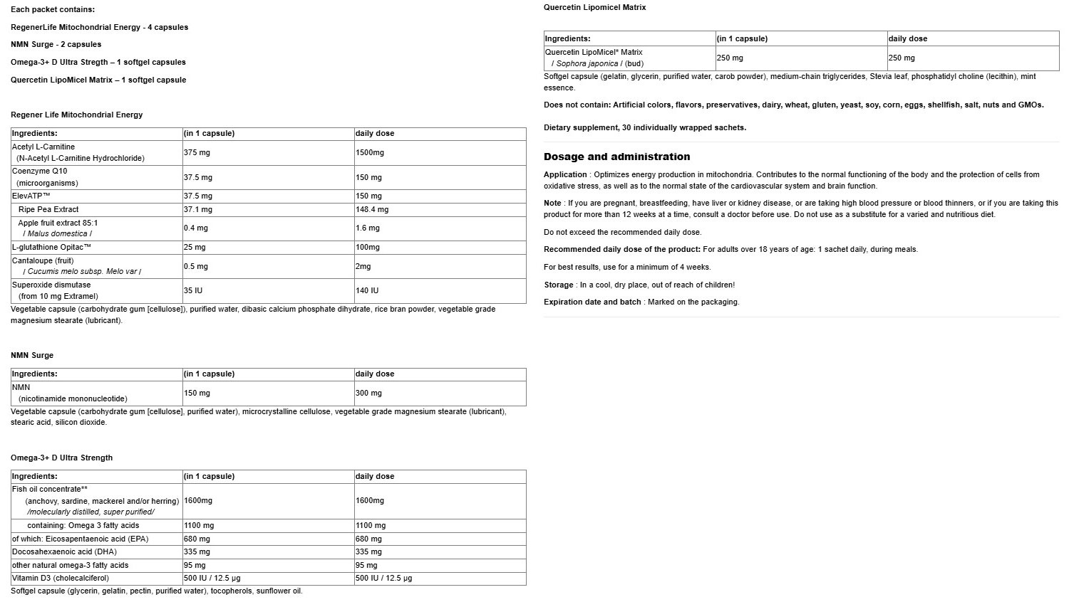 Съставки: Ацетил Л-Карнитин(N-Ацетил L-Карнитин хидрохлорид), Коензим Q10, ElevATP, Зрял грах екстракт, Ябълка екстракт от плод, L-глутатион Opitac, Пъпеш Канталупо, Супероксид дисмутаза, никотинамид мононуклеотид,Рибено масло, Омега 3 мастни киселини,Кверцетин