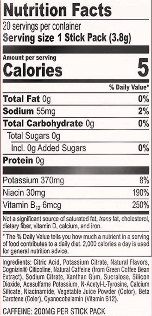 Съставки: вода, лимонена киселина, ябълчена киселина, естествени аромати, Cognizin® Citicoline, калиев бензоат (консервант), сукралоза, екстракт от листа на зелен чай InnovaTea®, ацесулфам калий, ниацинамид, N-ацетил-L-тирозин, натриев цитрат, цианокобаламин (витамин В12).
