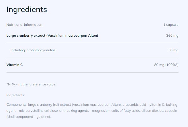 Съставки: екстракт от плодове на голяма червена боровинка (Vaccinium macrocarpon Aiton), L-аскорбинова киселина - витамин С, набухвател - микрокристална целулоза; противослепващи агенти - магнезиеви соли на мастни киселини, силициев диоксид; капсула (компонент на обвивката - желатин)