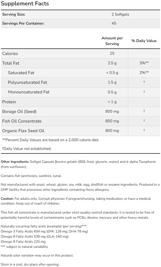 Тази комбинация от добре познати хранителни масла притежава уникален баланс на незаменимине мастни киселини омега-3 и омега-6, както и омега-9 - заменима, но изключително важна мастна киселина. Омега-3 (алфа-линоленова киселина), EPA и DHA, и омега-6 (гама-линоленова киселина), са необходими за поддържането на здрава кожа, нормален баланс на имунната система и правилна функция на нервната система.