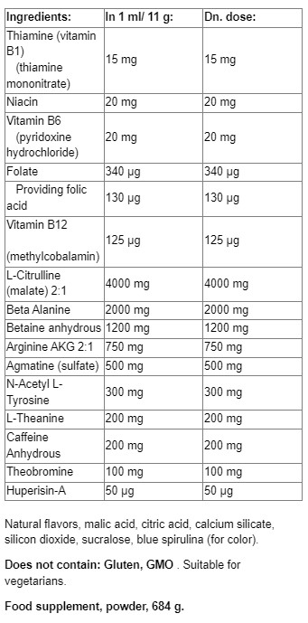 Начин на приемане: Приемайте 1 доза непосредтсвено преди тренировка разтворена в 200 мл. вода