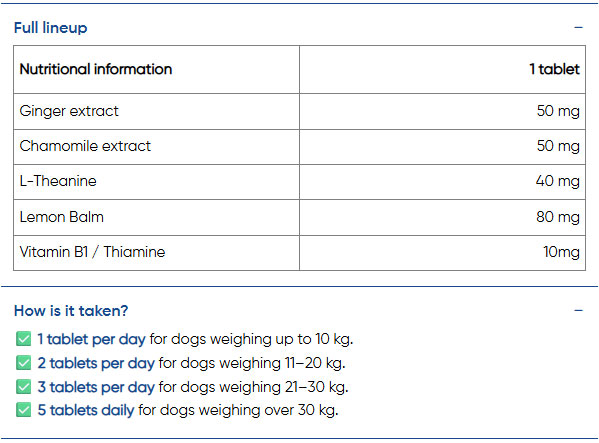 Редовната употреба на добавката осигурява на вашия четириног приятел необходимите микроелементи за добро физическо състояние и здрава нервна система. Calm & Relax не е само вкусна „наградка”, но и ще допринесе за неговото спокойствие, комфорт и самоувереност, правейки разходките и игрите още по-приятни. Вече няма да се нуждаете от помощник за вашето куче, няма да се притеснявате от неудобството му при стресови ситуации и ще се чувствате много по-спокойни.