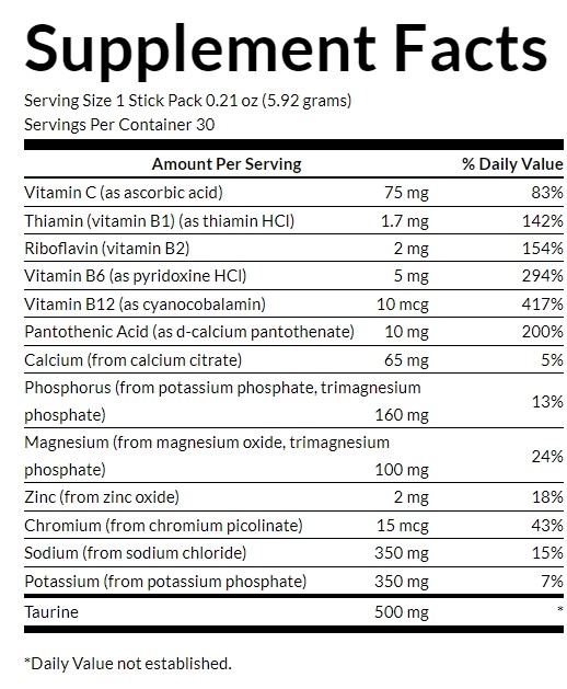 Съставки: витамин C, витамин B1, витамин B2, витамин B6, витамин B12, пантотенова киселина, калций, магнезий, натрий, калий, цинк, хром, таурин