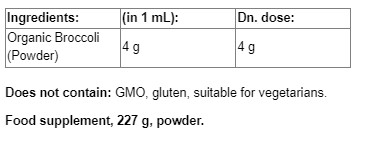 Основната активна съставка в Organic Broccoli Extract от Nutricost е екстракт от броколи, особено богат на антиоксиданти като сулфорафан. Това съединение е известно със способността си да поддържа естествените процеси на детоксикация на тялото, като допринася за цялостното здраве и благополучие.
