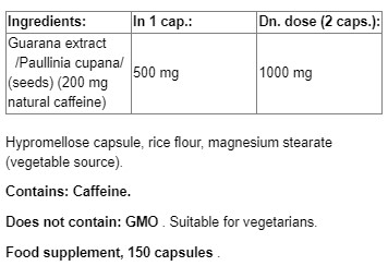 Основната активна съставка в Guarana от Nutricost - екстракт от гуарана, се извлича от семената на растението гуарана, произхождащо от Амазония. Гуараната е естествен източник на кофеин, който се освобождава по-бавно, отколкото други източници, осигурявайки по-продължителен енергиен тласък без резките сривове, свързани с кафето.