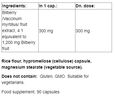 Съставки: Екстракт от черна боровинка (Vaccinium myrtillus) (плод) (4:1 екстракт, еквивалентен на 1200 mg черна боровинка), оризово брашно, хипромелоза (целулоза) капсула, магнезиев стеарат (растителен източник)