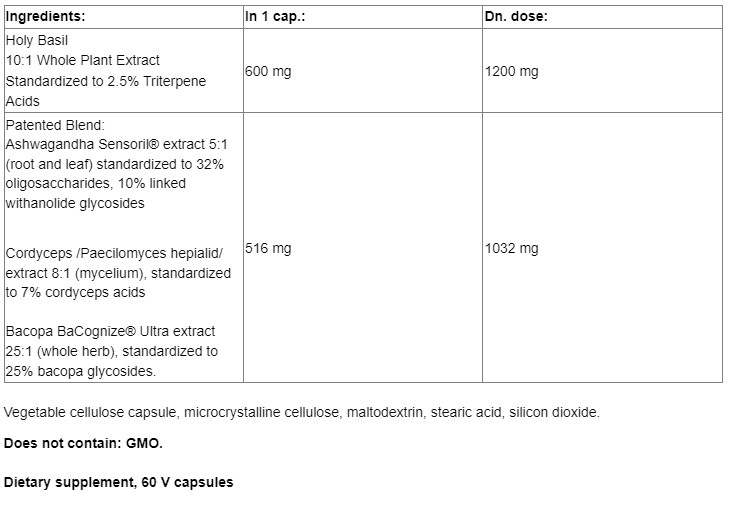 Съставки: Екстракт от свещен босилек (Ocimum tenuiflorum) 10:1 (цяло растение) [със съдържание на 2,5% тритерпенови киселини (15 mg)], патентована смес: екстракт от ашваганда (Withania somnifera) 5:1 (корен и листа) [с норма до 10% конюгати на сфанолидните гликозиди и 32% олигозахариди], екстракт от кордицепс (Paecilomyces hepiali) 8:1 (мицели) [с норма до 7% кордицепсова киселина], екстракт от ултра (Bacopa monnieri) 25:1 (цяло растение) [с норма до 25% бакопа гликозиди]