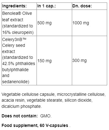 Съставки: Екстракт от маслини (листа) [със съдържание на 16% олеуропеин (80 mg)]р Екстракт от семена на целина [със съдържание на 42,5% пталиди (бутилфталид и седанолид (63,75 mg)], Други съставки: растителна целулоза (капсула), микрокристална целулоза, акациева гума, растителен стеарат, силициев диоксид, дикалциев фосфат.