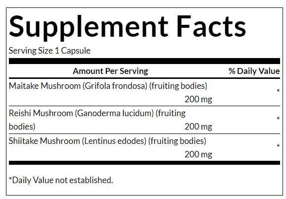 Swanson Full Spectrum Triple Mushroom Complex ви предоставя мощен съюз от три великолепни гъби: майтаке, рейши и шиитаке. Тази хранителна добавка е разработена от Swanson, водещата марка в сферата на хранителните добавки, и съчетава съставките, известни с богатството си от полезни вещества.