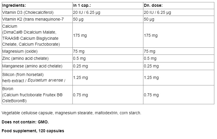 Съставки: Витамин D3 (като холекалциферол) (1000 IU)), Витамин К2 (като транс менахинон-7), Калций (от калциев карбонат, калциев цитрат малат, калциев бисглицинат), Магнезий (като магнезиев оксид), Цинк (като цинков аминокиселинен хелат), Манган (като манганов аминокиселинен хелат), Силиций [от хвощ (Equisetum arvense) екстракт (билка)], Бор (калциев фруктоборат като патентован Fruitex B® OsteoBoron®)