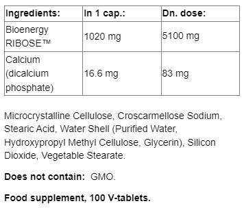 Съставки: Калций (като дикалциев фосфат), Bioenergy Ribose™ (D-рибоза без ГМО), Други съставки: микрокристална целулоза, кроскармелоза натрий, стеаринова киселина, водно филмово покритие (пречистена вода, хидроксипропил метилцелулоза, глицерин), силициев диоксид, растителен стеарат