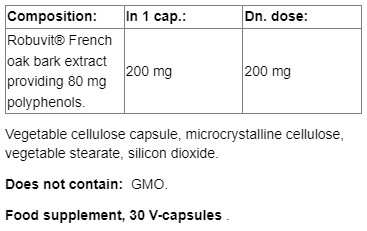 Съставки: Екстракт от дърво Robuvit® от френски дъб (Quercus robur) (осигуряващ общо 80 mg полифеноли)