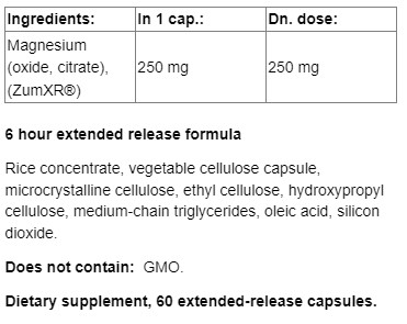 Съставки: Магнезий (като ZümXR™ магнезиев оксид, магнезиев цитрат)