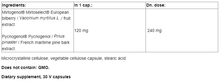 Съставки: Mirtogenol® [Mirtoselect® екстракт от европейска черна боровинка (Vaccinium myrtillus L.) (плод) и Pycnogenol® екстракт от изсушен френски морски бор (Pinus pinaster) (кора)]