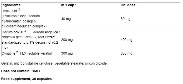 Съставки: Hyal-Joint® [хиалуронова киселина (натриев хиалуронат), колаген и гликозаминогликанов комплекс], Decursinol-50® (Angelica gigas Nakai) екстракт (корен) [с концентрация 0,1% декурсинол (0,2 mg)], Cynatine® FLX (осигуряващ разтворен кератин)