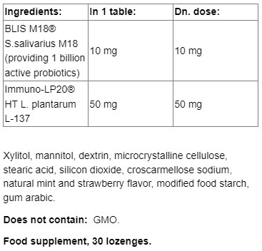 Съставки: BLIS M18™ S. salivarius M18 (осигуряващ 1 милиард CFU), Immuno-LP20® (HT§ L. plantarum L-137)