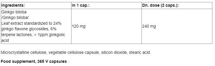 Съставки: Гинко билоба (листа) екстракт [станд. за 24% гинко флавонови гликозиди (28,8 mg), 6% общи терпенови лактони (7,2 mg) и <1ppm гинколова киселина]