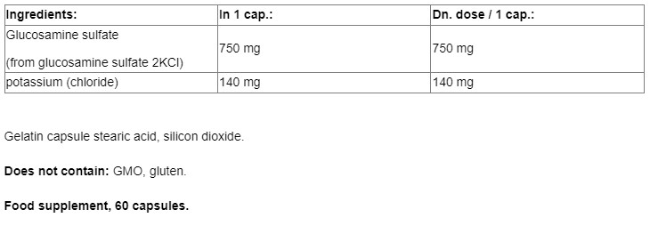 Съставки: Глюкозамин сулфат (от глюкозамин сулфат 2 KCl)