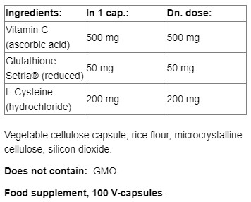 Съставки: Витамин С (като аскорбинова киселина), Setria® L-глутатион (редуциран), L-цистеин хидрохлорид
