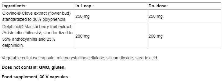 Съставки: Clovinol® екстракт от карамфил (цветна пъпка) [станд. до 30% полифеноли], Delphinol® maqui berry (Aristotelia chilensis) екстракт (плод) [станд. до 35% антоцианини, 25% делфинидини]