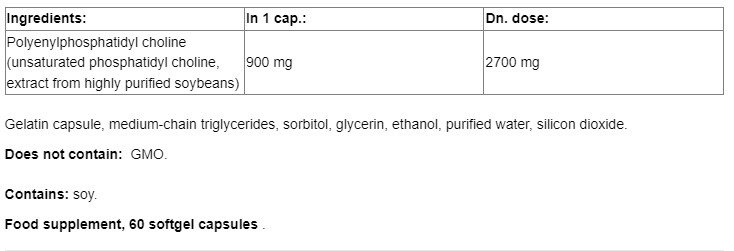Съставки: Polyenylphosphatidylcholine [Unsaturated phosphatidylcholine from highly purified soy bean extract]
