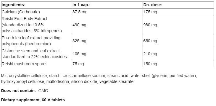 Съставки: Калций (под формата на калциев карбонат), екстракт от гъба рейши (плод) [до 13,5% полизахариди, 6% тритерпени], екстракт от чай Пу-ерх (лист) [осигуряващ полифеноли, теабраунин], екстракт от Cistanche tubulosa (стъбло и лист) [до 22% ехинакозиди], гъба рейши с разбита черупка (спори)