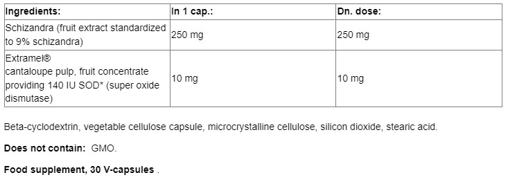 Съставки: Шизандра (Schisandra chinensis) екстракт (плод) [стандартно до 9% общо шизандрини (22,5 mg)], Extramel® концентрат от пулпа на пъпеш (Cucumis melo) (плод) (осигуряващ 140 IU SOD)